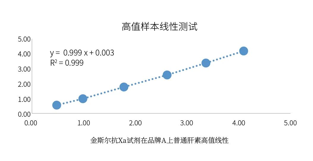 (2)國(guó)產(chǎn)抗Xa試劑可以滿足臨床預(yù)期用途:九強(qiáng)抗Xa試劑盒普通肝素線性可以做到4IU/mL,不僅可以滿足說明書所宣稱的1.2IU/mL,同時(shí)可以滿足臨床上的一些異常特殊高值樣本的檢測(cè)需求;