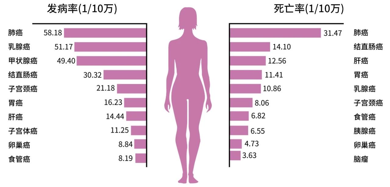 中國(guó)女性前十位惡性腫瘤發(fā)病率/死亡率及順位