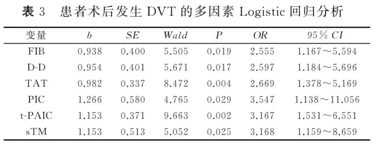 本次研究顯示,DVT組FIB、D-D、TAT、PIC、t-PAIC、sTM 顯著高于非DVT組,提示FIB、D-D、TAT、PIC、t-PAIC、STM可能與創(chuàng)傷性骨折患者術(shù)后DVT風(fēng)險(xiǎn)有關(guān)。