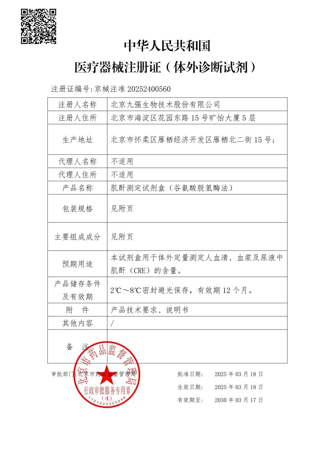 再添利器!九強生物肌酐測定試劑盒獲證!