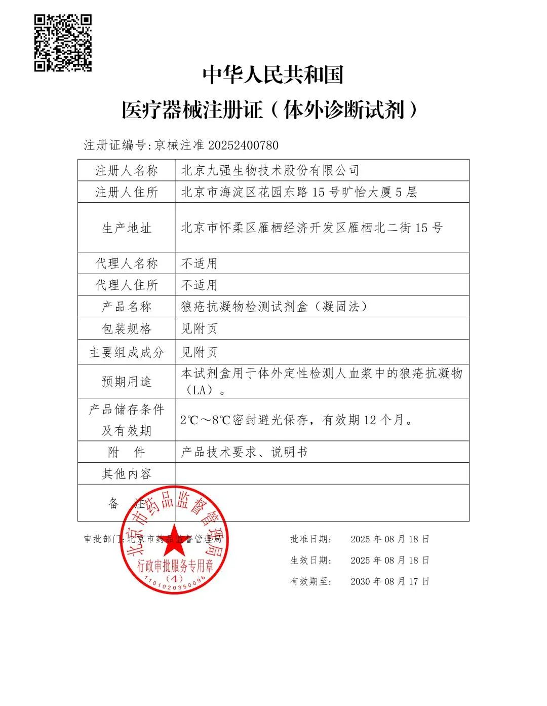 近日,九強(qiáng)生物狼瘡抗凝物檢測(cè)試劑盒(凝固法)順利取得國(guó)家藥品監(jiān)督管理局頒發(fā)的《醫(yī)療器械注冊(cè)證》(注冊(cè)證號(hào):京械注準(zhǔn) 20252400780)。